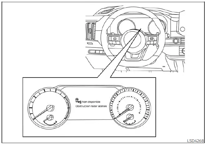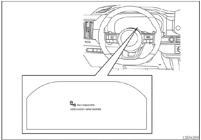 Lorsqu'une obstruction du radar est détectée, le système est automatiquement désactivé. Le message d'avertissement " Non disponible Obstruction radar latérale " s'affiche à l'écran multifonction.