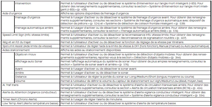 Le menu Driver Assistance (aide au conducteur) permet à l'usager de modifier les différentes aides à la conduite et au stationnement, ainsi que les options de freinage.