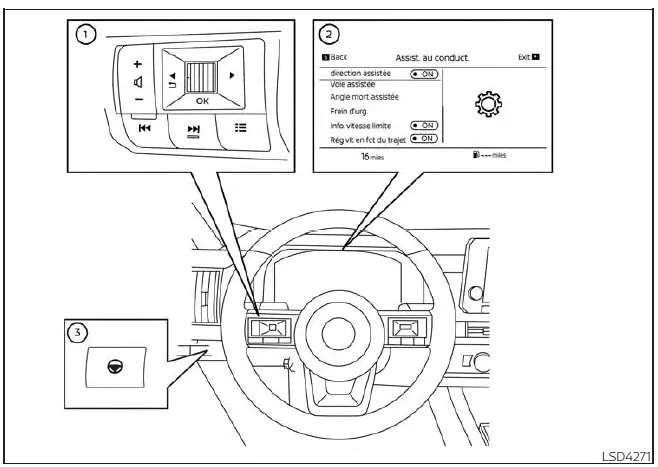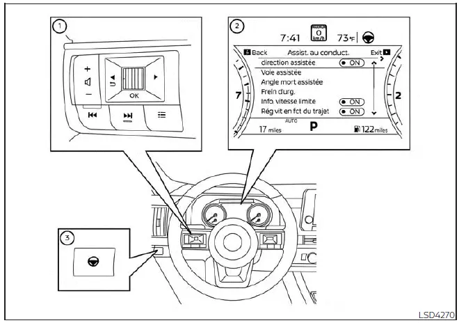 Le système de direction assistée contrôle le système de direction, ce qui permet de garder votre véhicule près du centre de la voie lors de la conduite. La direction assistée est combinée au régulateur de vitesse adaptatif. Pour obtenir des renseignements supplémentaires, reportez-vous à la section " Régulateur de vitesse adaptatif (pour les véhicules avec ProPILOT Assist) ".