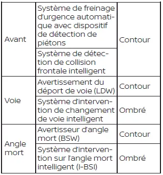 Lorsque les systèmes d'intervention de changement de voie intelligent (I-LI) et d'intervention sur angle mort (I-BSI) sont activés dans le menu des réglages de l'écran multifonction, l'activation du système ProPILOT Assist entraîne simultanément l'activation des systèmes I-LI et I-BSI. Si le système I-LI est désactivé dans le menu des réglages, il est automatiquement activé lorsque le système de direction assistée est activé.